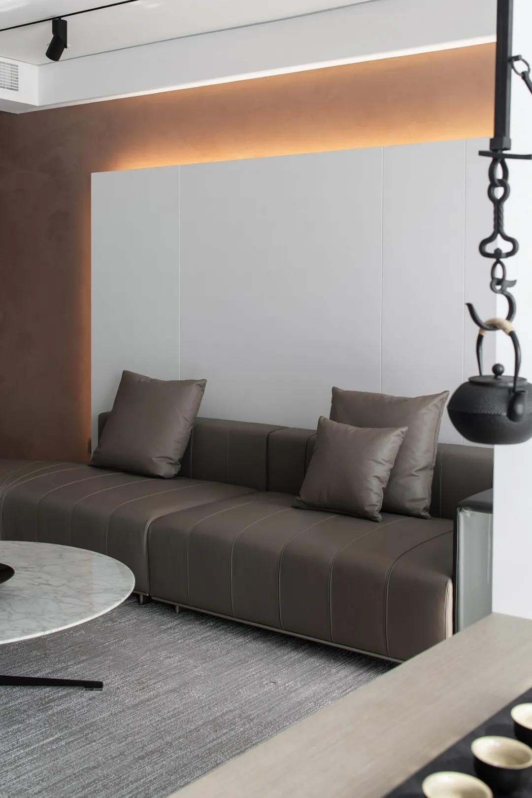 木質(zhì)茶桌的運用,將其從整體空間獨立出來,張弛有度的空間力量,彰顯出當(dāng)代更流行的空間設(shè)計美學(xué),以極簡的設(shè)計,來營造充滿藝術(shù)感的家居氛圍。