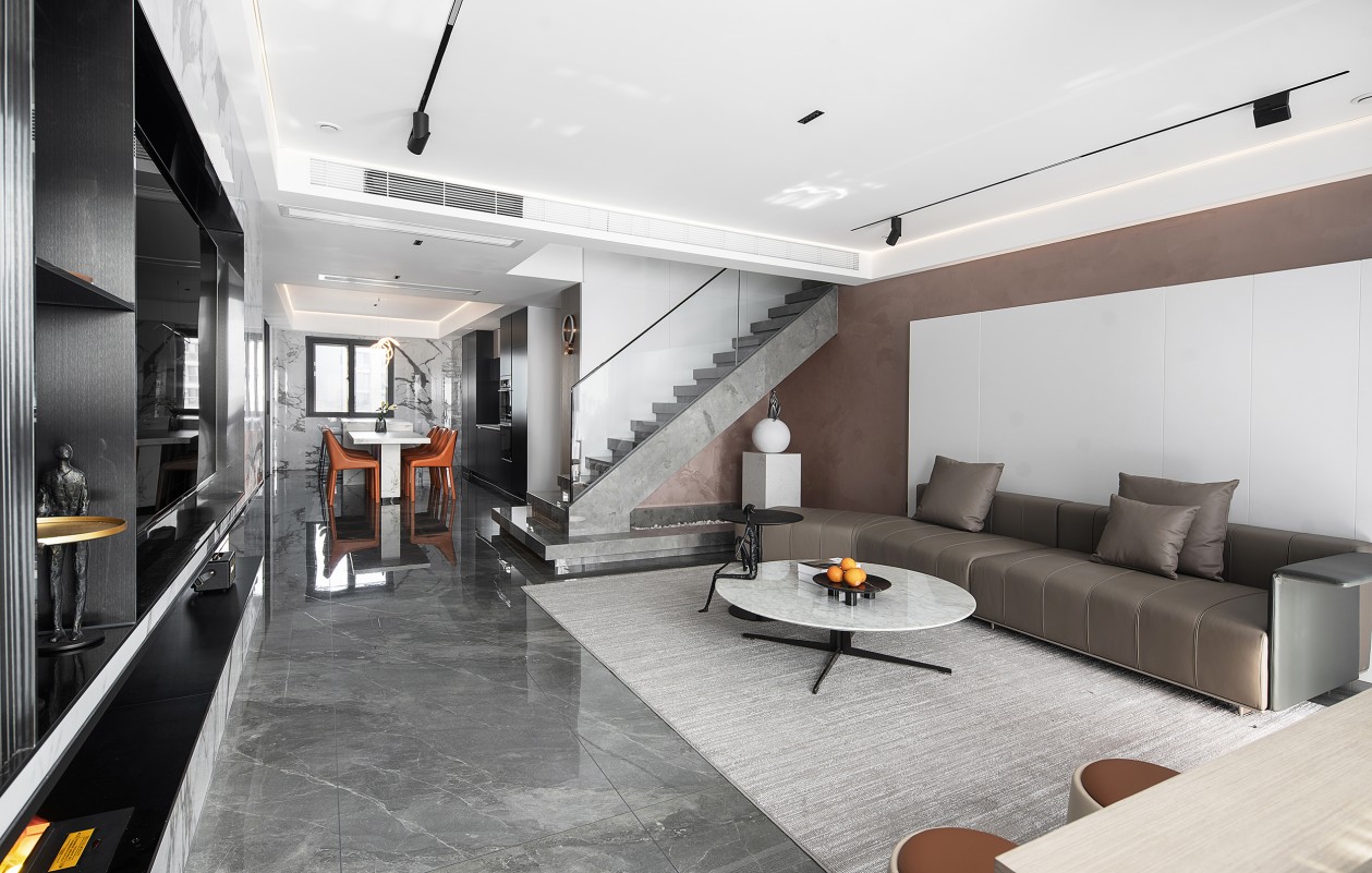 黑色的紋理大理石延展到空間的角角落落,奠定了空間沉穩(wěn)內(nèi)斂的底色。淺咖色的皮質(zhì)沙發(fā)與木質(zhì)、柔軟的布藝地毯相互碰撞,讓空間最大程度地提升了空間質(zhì)感和細節(jié)感。白色的邊幾與大理石圓桌布置個性創(chuàng)意的小飾品,也讓空間顯得更加舒適而有趣。
