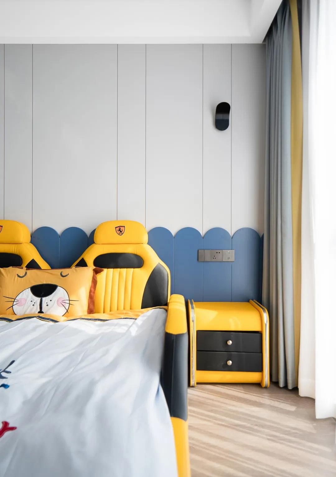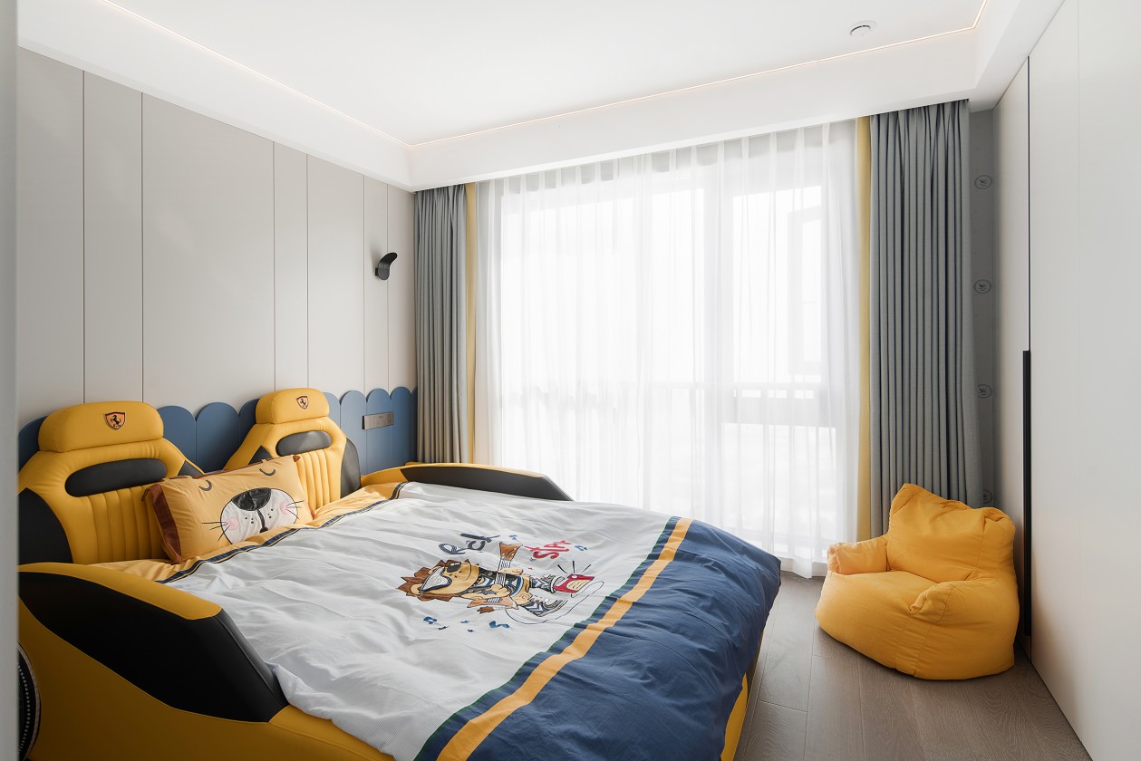 兒子房采用了柔和的黃與淡雅的藍作為點綴,汽車造型的床為空間增加了活力,與柔軟的懶人沙發(fā)相互映照。搭配上充滿童趣的裝飾擺件,趣味十足。陽光穿透紗簾,為房間輸送清晨的第一縷光,旨在營造治愈而優(yōu)雅靈魂居所。