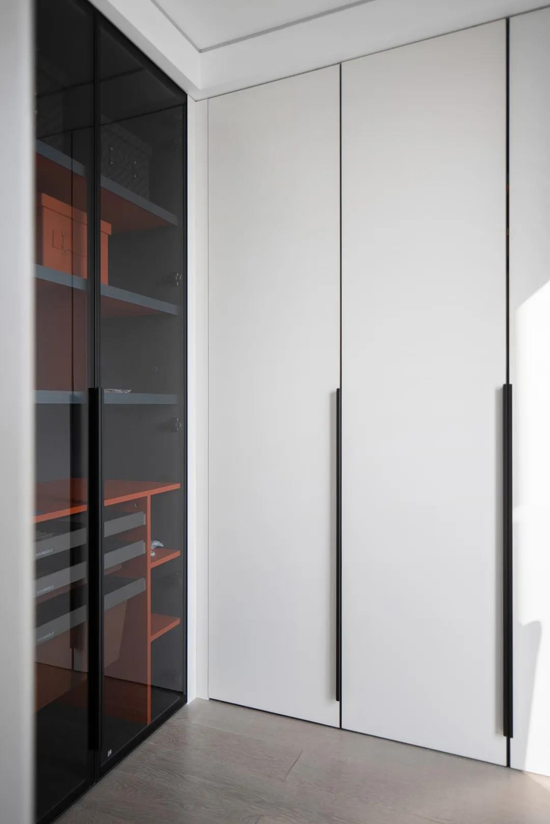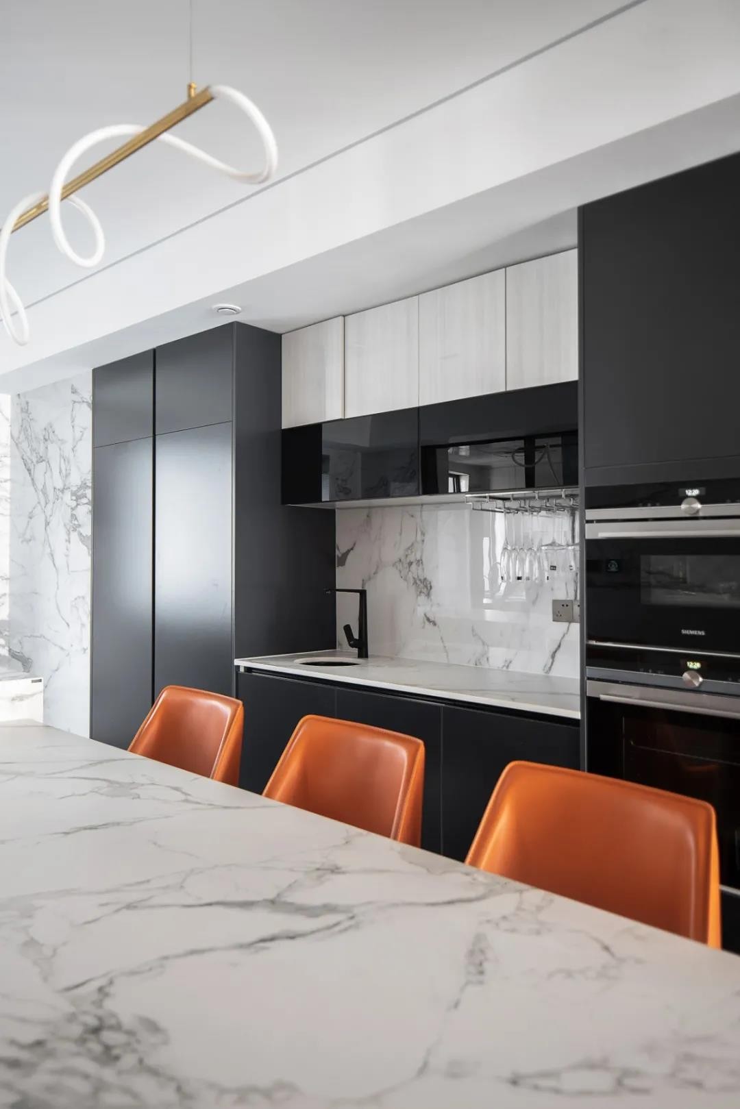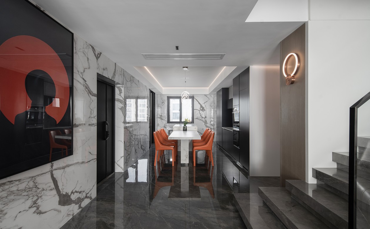 客廳餐廳毗鄰,使得空間通透,視野開闊。餐桌與島臺的高低變化,嵌入式聯(lián)排柜門深邃高雅,細膩鋪敘用餐空間的雅致風(fēng)情。色彩上,愛馬仕橙的皮質(zhì)座椅在黑與白之間跳躍,在經(jīng)典與現(xiàn)代之間,行走在時尚的天秤上,平衡著功能性與時尚美感。