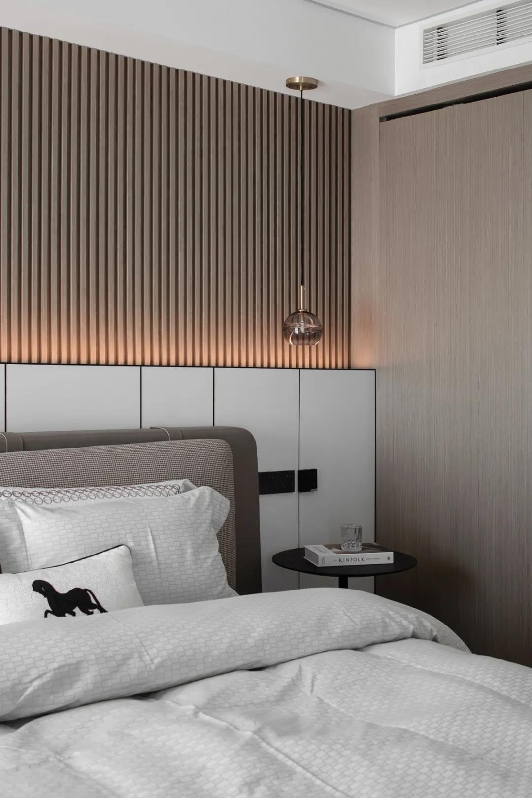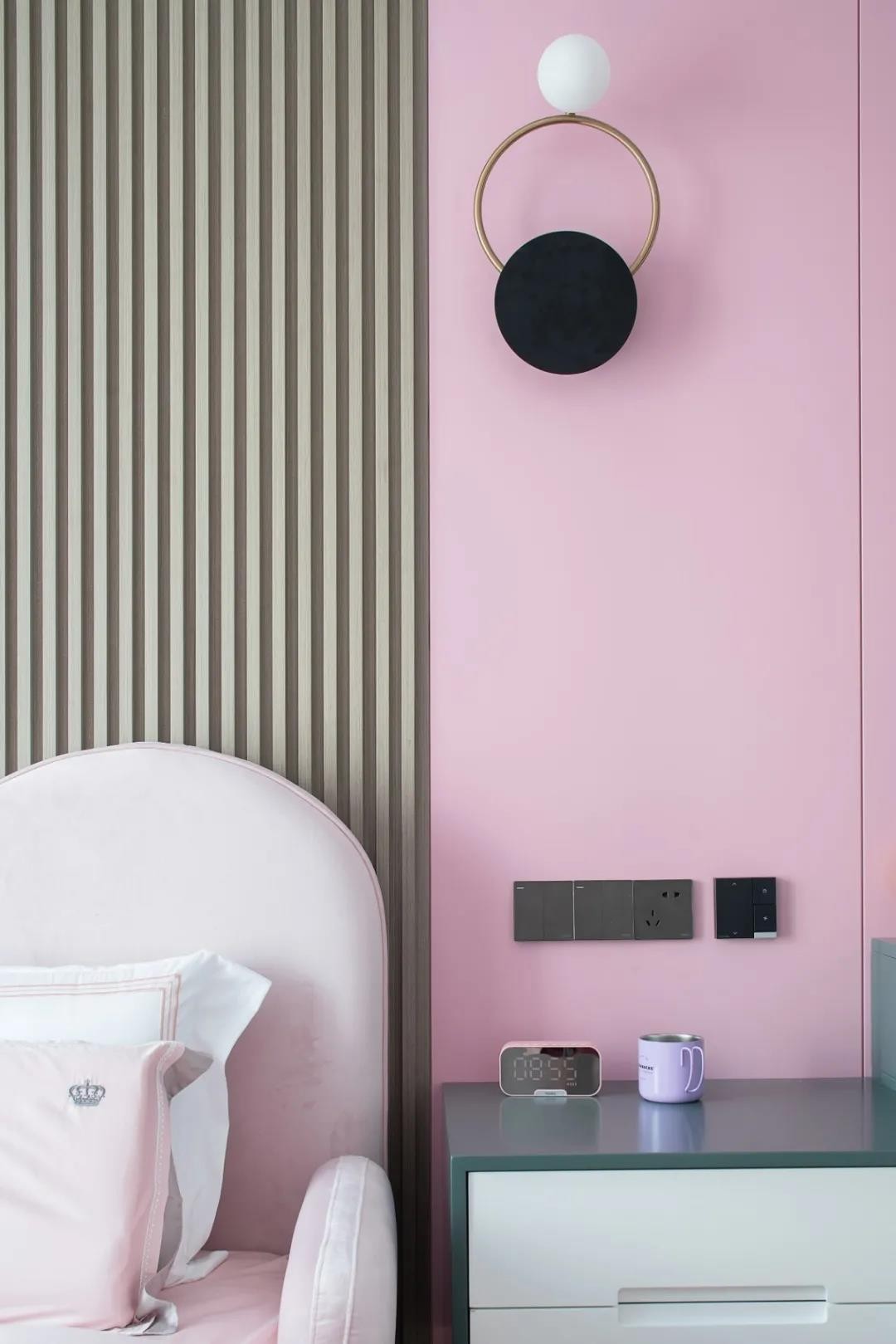 女兒房則選用了灰+白+粉的溫馨搭配,豎條紋理的背景墻融合色彩,粉色的床體與墻體交相呼應(yīng),讓整個空間煥然一新。床頭裝上了金屬圓形小夜燈并配置了獨立小衣帽間,簡約,是細致入微。