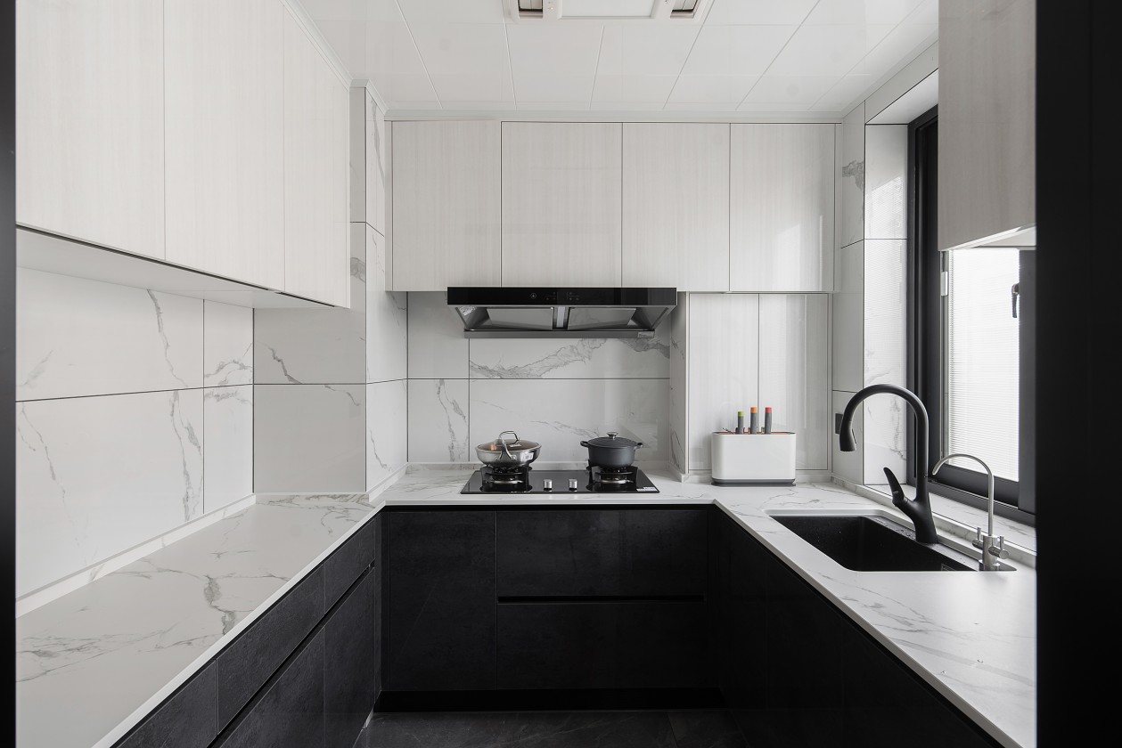 黑白搭配有很良好的平衡感,在廚房小空間的運用上,白色吊柜搭配黑色地柜,既不會顯得局促也能很好的表現(xiàn)出層次感。拋開一切冗余的元素,同時注重線點面及其細節(jié)處理。一眼能看透的空間+流暢的行動線條,讓廚房的高級感瞬間凸顯。